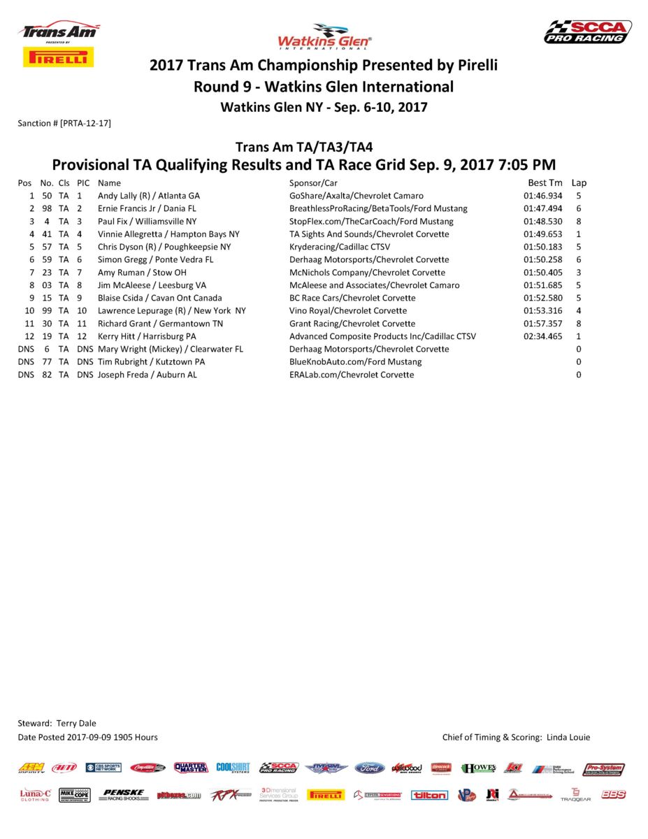 WATKINS GLEN, NY. [September 9, 2017] – Andy Lally will start on pole come tomorrow’s Trans Am Series presented by Pirelli competition at Watkins Glen International as he makes his Series debut in the No. 50 GoShare/ Axalta Chevrolet Camaro. Also starting in front of their respective groups in the 102-mile, 30-lap multiclass competition will be Cindi Lux, in the No. 45 Lux Performance Dodge Challenger, and Brian Kleeman in the No. 07 DWW Motorsports Ford Mustang.