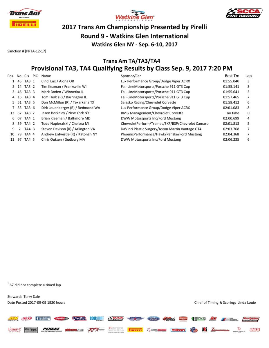 In TA3, veteran Cindi Lux, in the No. 45 Lux Performance Dodge Viper, captured her first pole of the 2017 season with a 1:55.040-lap, also a new track record. Lux’s time eclipsed the prior TA3 qualifying record, a 2:05.900 set last year—showcasing the new Pirelli tire package and the Viper’s V10.