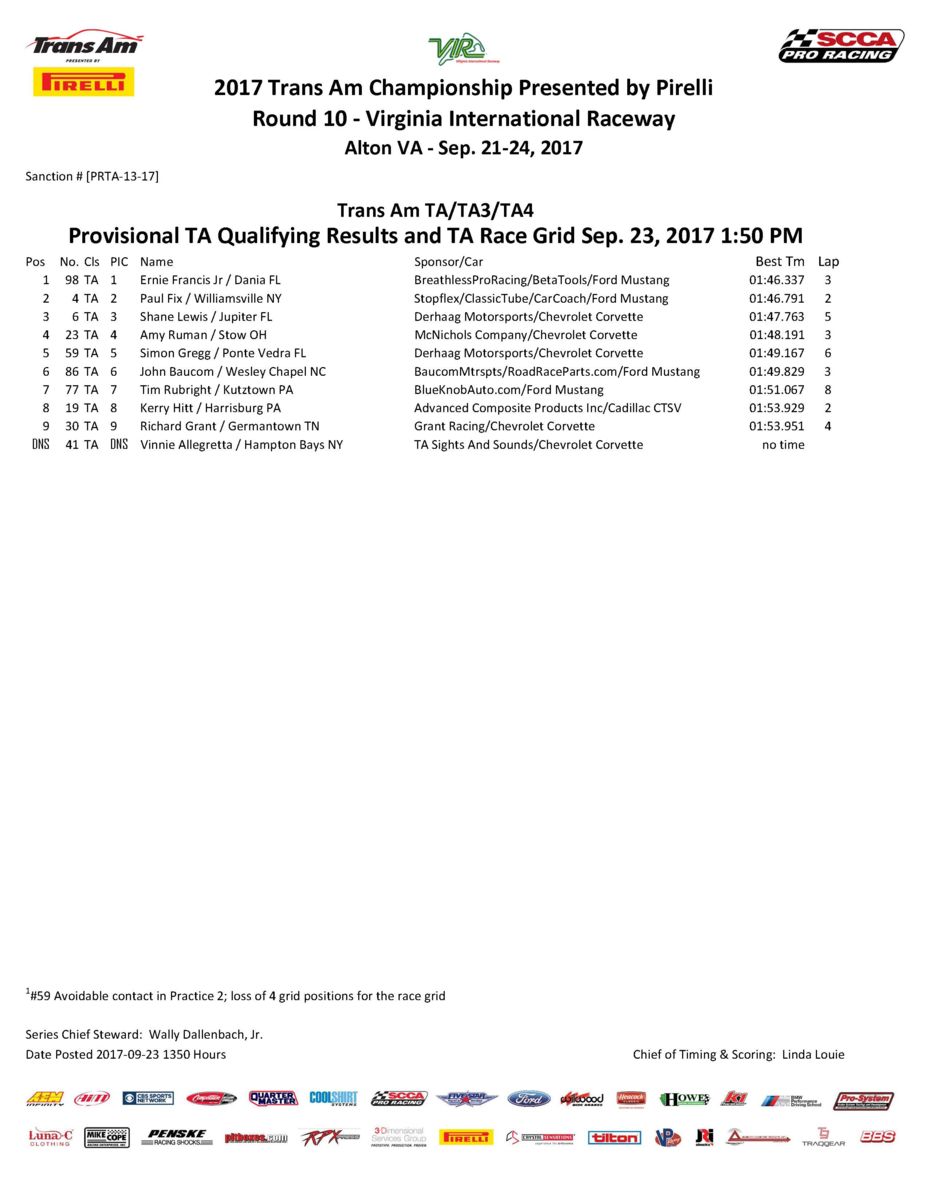 Two-time defending TA class champion Amy Ruman, in the No. 23 McNichols Company Chevrolet Corvette, was fourth quick in qualifying with a 1:48.191; and while Simon Gregg, in the No. 59 Derhaag Motorsports Chevrolet Corvette, turned a fifth quick 1:49.167, a four starting-position penalty was enforced upon the No. 59 for avoidable contact in an earlier session.