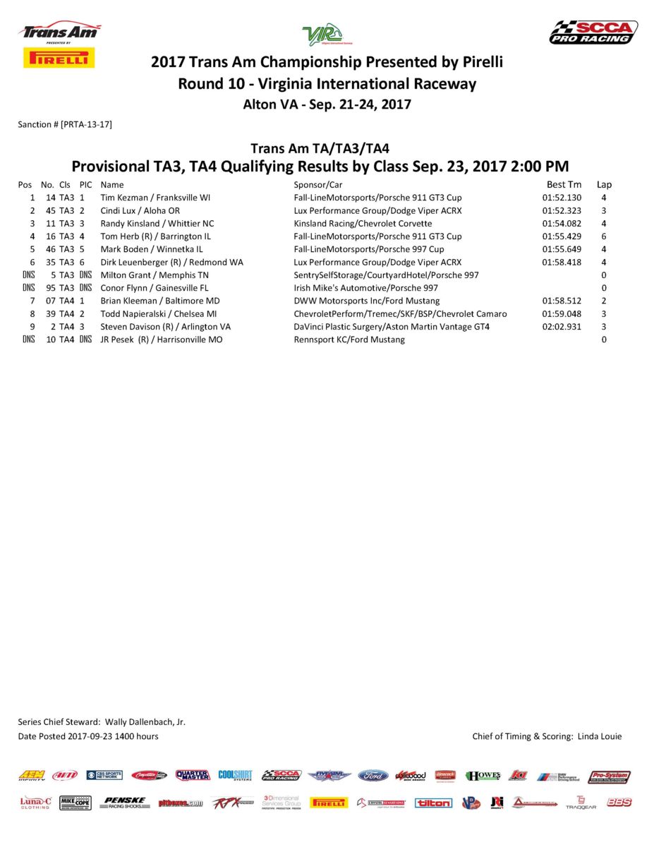 After sitting out the previous two rounds, a returning Randy Kinsland, in the No. 11 Kinsland Racing Chevrolet Corvette, turned a 1:54.082 lap for third starting position; while Fall-Line compatriots Tom Herb, in the No. 16 Fall-Line Porsche 911 GT3 Cup, and Mark Boden, in the No. 46 Fall-Line Porsche 997 Cup, completed the TA3 qualifying top five with times of 1:55.429 and 1:55.649, respectively.