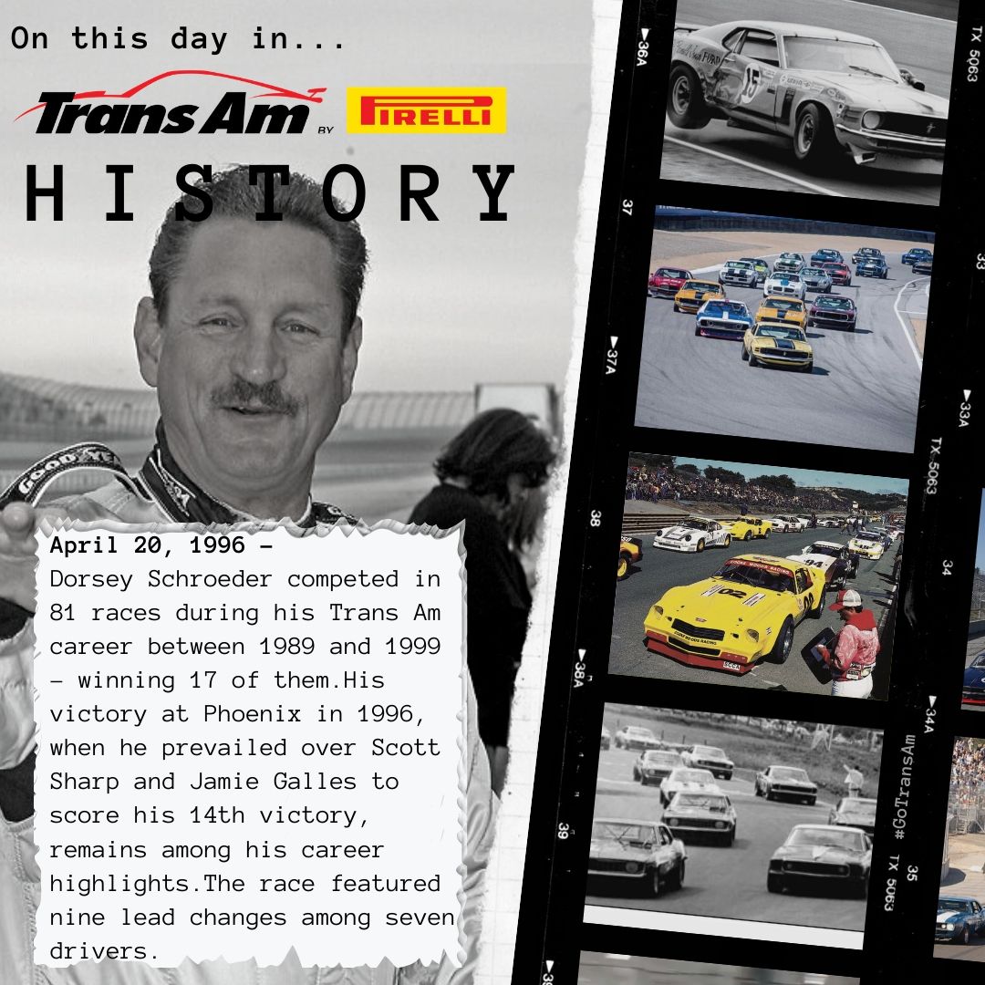 “I think that was the most leaders in a Trans Am race, ever, and the most lead changes,” Schroeder said. “It was quite an amazing race, because so many different people led it. It was typical Phoenix hot and sandy, and if anyone dropped a wheel off in the infield it brought sand on the track, and it was just like a skating rink. And it went on and on. It was an amazing race.