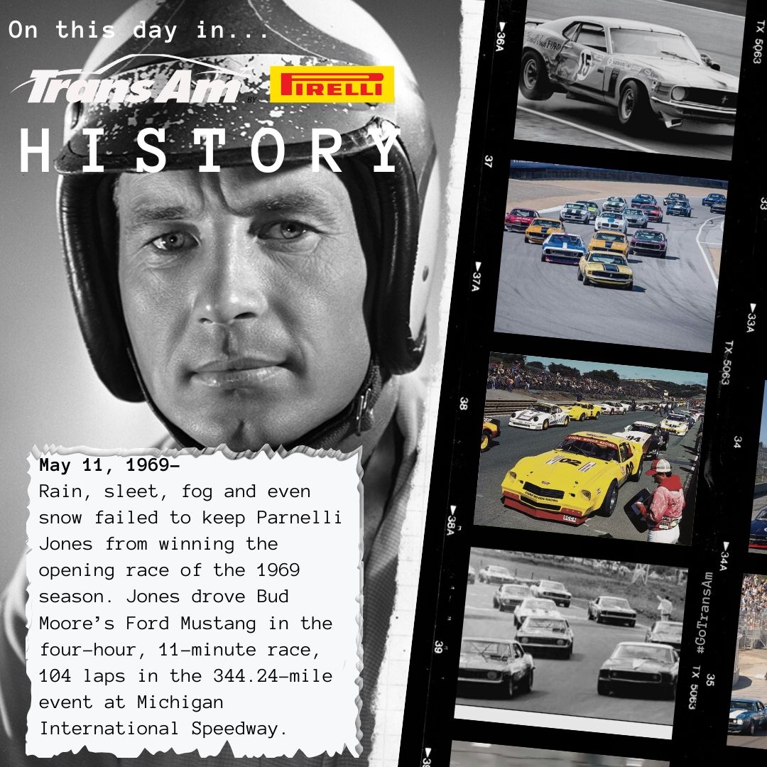 Rain, sleet, fog and even snow failed to keep Parnelli Jones from winning the opening race of the 1969 Trans Am Series season. Jones drove Bud Moore’s Ford Mustang in the four-hour, 11-minute race, 104 laps in the 344.24-mile event at Michigan International Speedway.