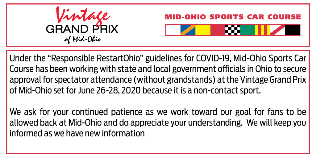 Clagett: As of today, the event will be held without spectators. Last Friday, Mid-Ohio announced that it is working closely with the state government in an attempt to allow fans to return to Mid-Ohio (see official announcement from the track below).