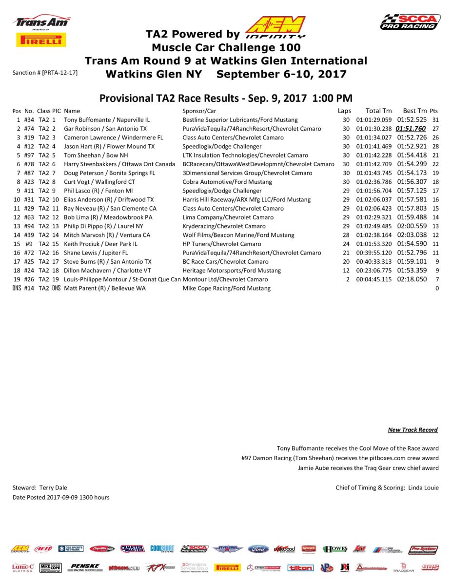 WAKTINS GLEN, N.Y. [September 9, 2017] – Tony Buffomante secured his fourth TA2 class win of the 2017 season today at Watkins Glen International, emerging atop the 19-car TA2 field in 102-mile race around the 3.4-mile track that saw four different leaders and a restart with only five laps remaining. Buffomante, the 2016 TA2 champion, was joined on the podium by two other former champs— Gar Robinson, 2015, and Cameron Lawrence, 2014 and 2013—completing the podium.